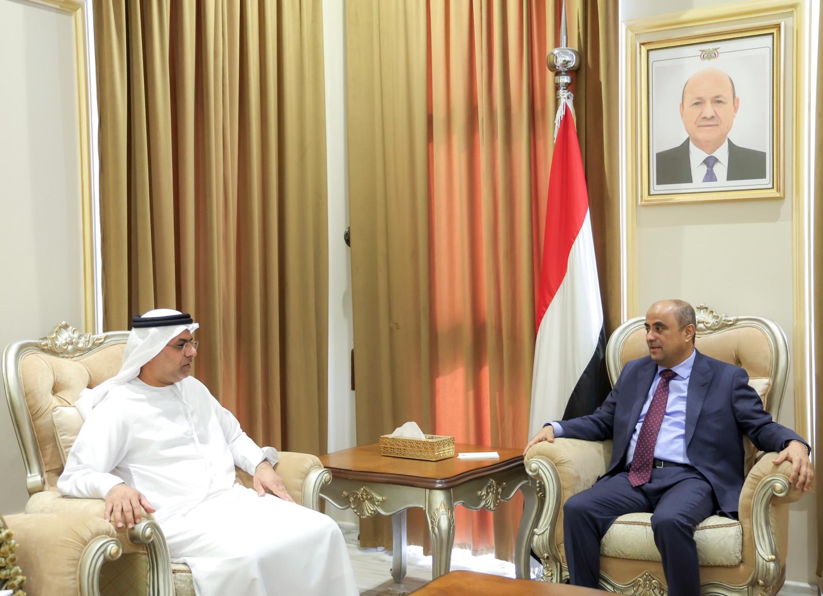 كما استقبل رئيس الوزراء سفير دولة الإمارات العربية المتحدة، محمد حمد الزعابي، حيث جرى استعراض مستوى العلاقات الأخوية المتميزة، والدعم الاقتصادي والسياسي والإنمائي الذي تقدمه الإمارات، ومنها مشاريع الطاقة المتجددة كمحطة الطاقة الشمسية في شبوة ومشروع التوسعة في عدن.